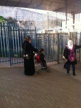 Busy traffic of children, some very small, some crossing the checkpoint by themselves.  Then they wait for their transportation. To begin with, only one passage is open, then another opens and the line disappears. At the exit to Al Ezariya, a family with a partly paralyzed child in a pram tries to catch the eye of the female soldier in charge of the humanitarian gate — to no avail.