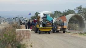 Four tractors are waiting with loads of plastic and metal junk for recycling. People receive 1.70 NIS for each kilogram of plastic or metal. Ambitious people such as our friend Mahmud collect old chairs, tables, cabinets, fencing, shopping carts and other junk from various places. Unlike before, the soldiers now let everyone cross without checking. Only a year ago Mahmud was forced to plead with soldiers to bring every broken plastic chair across to the village. He has often lost the argument with the woman soldiers and was obliged to leave the junk scattered among the trees at the checkpoint.