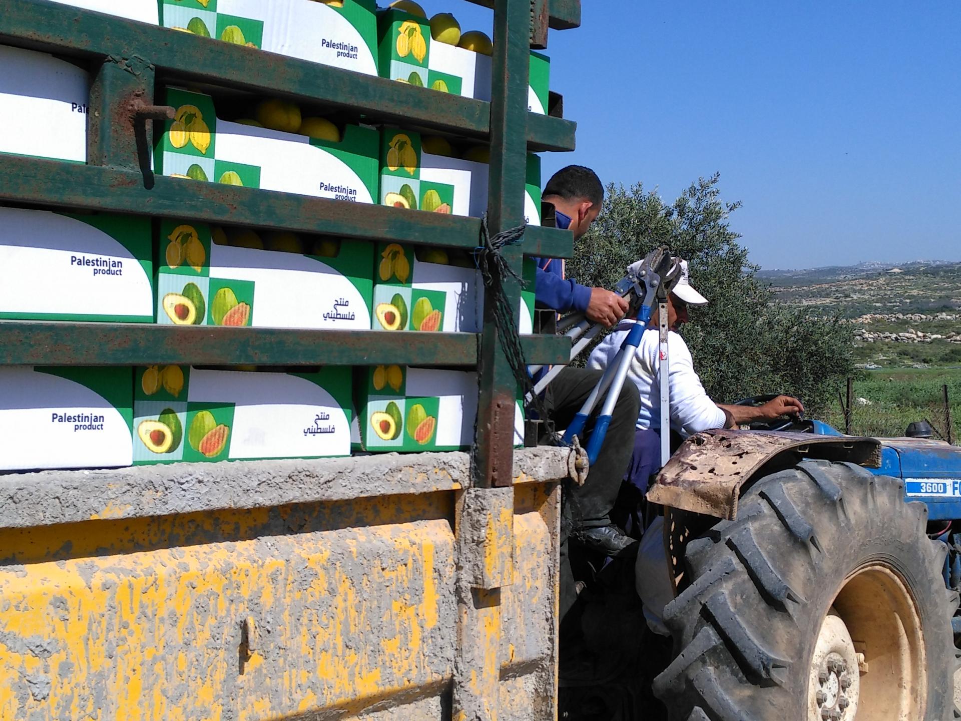 Two tractors also return, one with cartons filled with produce on which is printed “Palestinian Product” in English and Arabic.