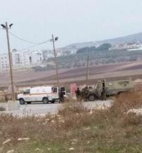We see the soldiers questioning the two Palestinian drivers for about 10 minutes. The Jeep drives away, and we think the two will be released, but this is not the case. Then two jeeps drive by, then another jeep and another, then a command car, all taking the road to Nablus. A military ambulance passes and continues toward Nablus, then turns and pulls into the Beit Furiq entrance. The command car returns and parks in back of the ambulance; a wheelchair is taken out of the ambulance. About 10 soldiers get out of the command car. After about half an hour, the two detained cars are told to park a little farther up the road.