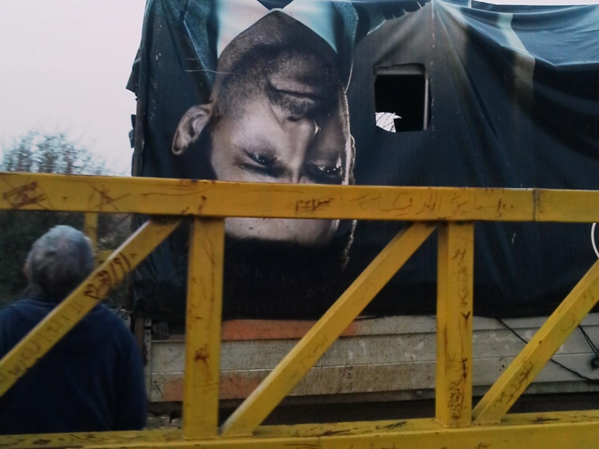 Some time before 07:00 we arrive at Falamiye South, which is the gate that serves the farmers of Jayyus. The soldiers are already here and perform the checking procedure relatively quickly. The driver of the closed truck, who arrives there per schedule, has organized a new cover for the truck, a sheet on which there is the photographed head of a handsome man upside down