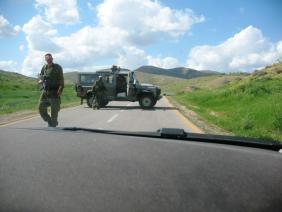 Meanwhile a few cars had arrived, filling the road. We saw the soldiers signaling to cars coming from the west to turn around and go back.