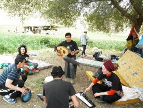 13:30, Samara (south of the Um Zuka reserve) – members of the Jenin Freedom Theatre, founded by Arna Mer and her son Juliano, have come out on a wondrous journey to visit the brave residents of the Jordan Valley who are holding on to their land steadfastly in both the Palestinian Jordan Valley and the South Hebron Hills (the bus will be visiting there next week). In daytime the young actors keep the children busy with games, singing and dancing, and in the evening they perform for the adults. In between they sit under a tree and play music – strumming the oud, drumming the darbouka, playing the accordion and other instruments whose names are unfamiliar to me, but their lovely tones float up in the warm breeze above the reddish hills of the Jordan Valley and carry a message of freedom and rectitude. Next to them a group of youngsters from Finland, Wales and even Majdal Shams has joined the activists of Jordan Valley Solidarity in order to build a schoolhouse for the children of the region, out of mud bricks.