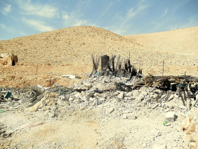 On the way Rashid shows us a new structure, a refrigerated storeroom for dates grown in the area. It holds 40 tons of dates, and there’s a demolition order. The bulldozers could arrive any day, “And then what will become of us?,” he says, expressing the existential anxiety everyone feels. Farther east, next to the junction of the Hamra-Jiftlik road with Highway 90, are more poor, miserable habitations; there the army demolished the sheepfold.