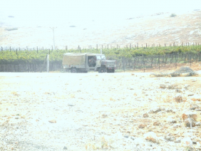 Opposite the Ro’i settlement, where a concrete sign (one of many scattered throughout the Jordan Valley) identifies a firing range, Israelis planted two vineyards. Six months ago a “nature festival” was held behind them where 10,000 high young Israelis cavorted to rhythm of loudspeakers blasting the eardrums of everyone living in the area. The dirt road created for the festival is often used by Palestinians who are tired of the long detour they’re forced to make to travel back and forth from the Jordan Valley to the West Bank through the checkpoints. A month ago Khaled, who distributes water to residents of the area, was caught here and his tanker confiscated. The state of Israel demands NIS 8000 to return it. It’s parked in Qalqilya. Why was it confiscated? For entering a firing range.
