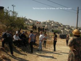 A road five meters wide is being paved for the settlers’ benefit, which the Palestinian landowners will be prohibited from using on Saturdays and holidays, on land belonging to the Jaber family – Razem, Matariyya, Idris and Dana. We see a quiet gathering of the landowners. Giv’ati soldiers, police and workers stand around, waiting for instructions. One of the landowners said that the court in Jerusalem ruled that the road can’t be built on their land but that the army and police aren’t obeying the ruling, for security reasons. Leah can’t restrain herself in the face of the injustice, and to the amazement of the shocked onlookers, not needing a loudspeaker, here’s some of what she says to the soldiers on the hill: