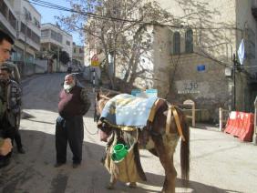 We walked to the Tarpat checkpoint. The milk seller and his donkey argue for a long time to be allowed through the gate to H1 to sell his goods. The soldier insists that he can go through, but not the donkey.