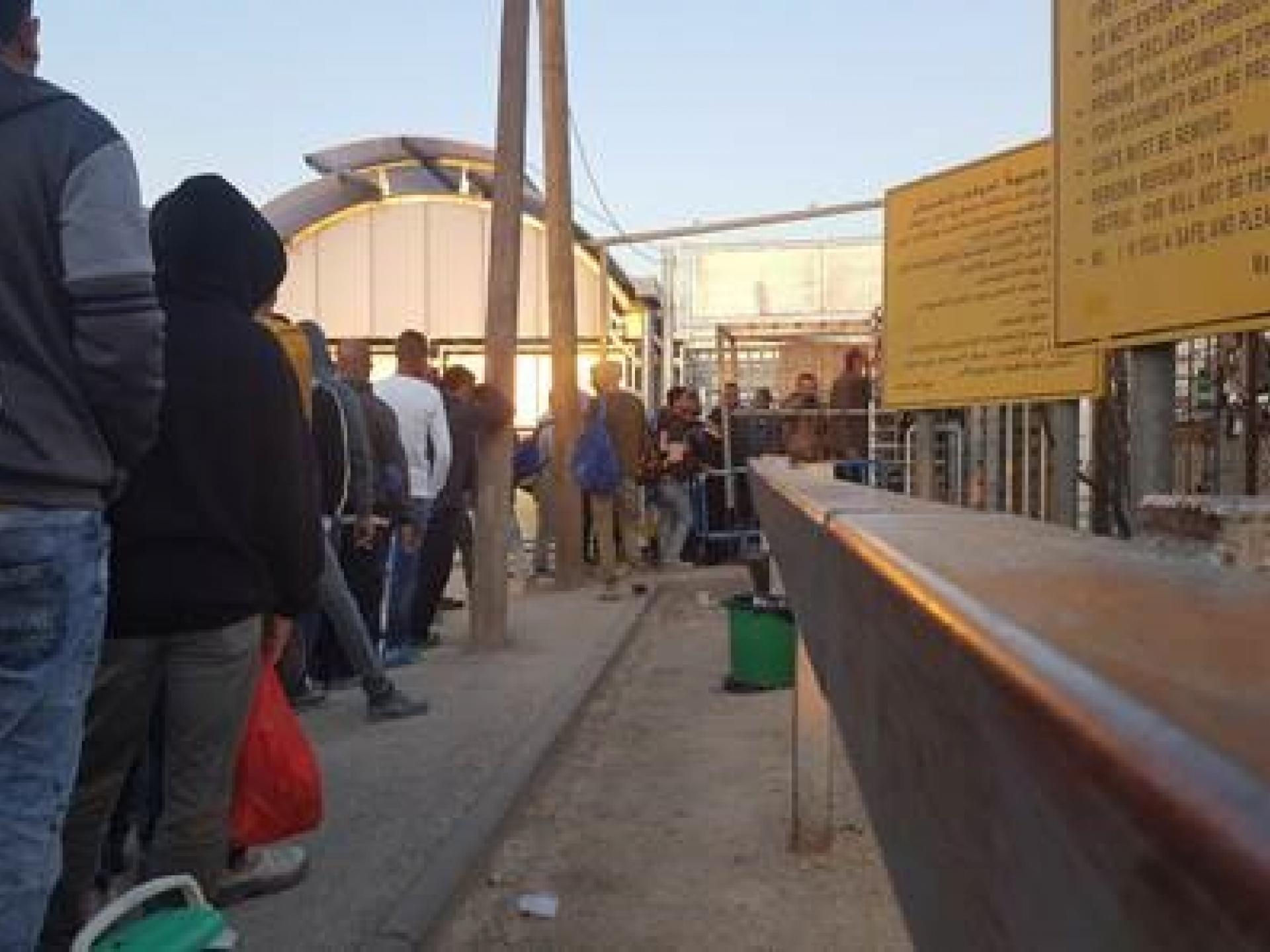 The usual, familiar morning waiting line at the entrance to the Barta’a Checkpoint. People wait in groups in the open air, passage pace shifts from slow to fast, there is only one functioning turnstile. Soon everyone will miss this. Soon the new installation will be in operation, containing four turnstiles and people led like cattle in crowded tracks in which one cannot move but only proceed one behind the other. Indeed in summer the sun will not blaze on them but the heat inside the metal shed will be unbearable.