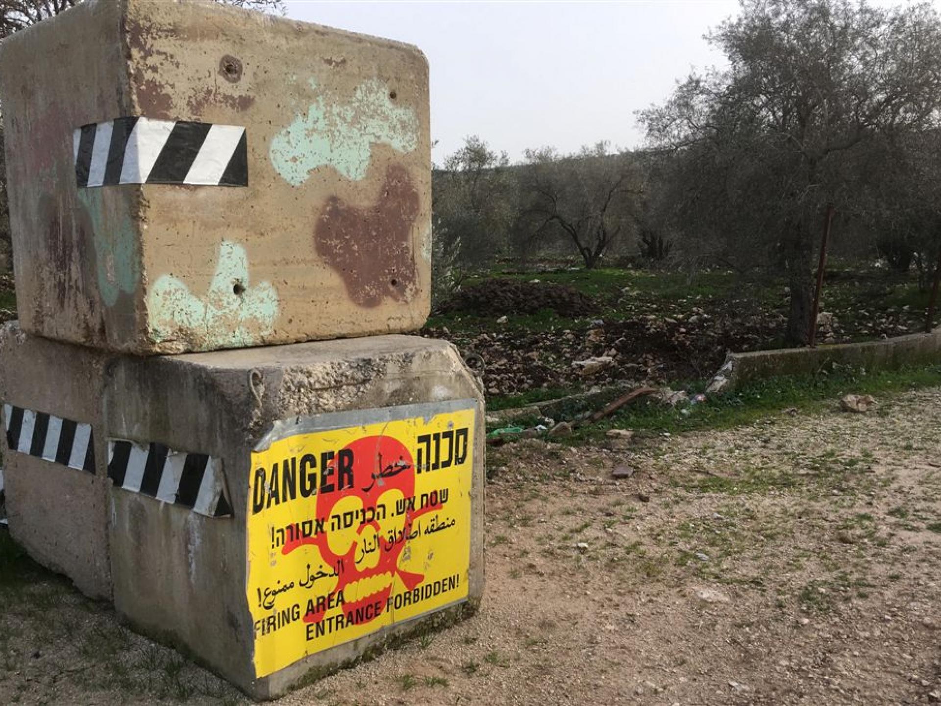 On our way to Ya’abed something stops us – an unusual crowd at the side of the road north of the checkpoint. We parked to look. The Border Police (men and women) stopped all those returning from work in the seamline zone and Israel, and they had to wait obediently while their documents and permits were being checked. Some of them waited until their issues was cleared up by phone. The elderly were sent to wait in a shed, but after a few minutes those over age 55 were allowed to go on their way. At 15:45 the police crossed the checkpoint and passed to the West Bank (we could not see where) and we continued to Ya’abed. We stopped at Umrikha to photograph the “firing zone” warning sign that has been placed right in the village!
