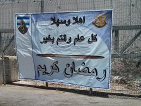 We arrived at an empty checkpoint. Very few crossing, a lot fewer than the soldiers and policemen around. We crossed to the Palestinian side and there too we found more of our security forces. On the road leading from the checkpoint to the village there we police barriers creating several lanes: one for exit, three for entry — for men, for women, and for humanitarian crossing (see photo). After crossing, one reaches a sign greeting passengers with Ramadan Karim (see photo).