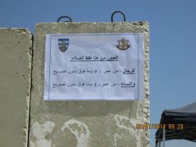 There was almost no one crossing, but plenty of soldiers, policemen and border police, standing under the gazebo with a large fan. On our way we had heard on the radio that only men over 50 with blue IDs would be allowed to enter the Temple Mount for prayers. Now a pleasant female soldier tells us that also women over 40 and children under 14 can cross without a permit (excluding residents of Hebron). When we crossed to the Palestinian side, we saw a sign to that effect (see photo).