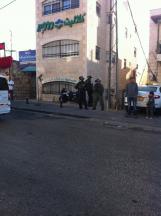 Two border police vehicles and two more teams in the street itself, opposite the schools. The pictures speak for themselves: Border Police lined up in military formation: two facing the street – helmets and weapons and frozen expressions on their faces – and another one facing the alley, covering them from the back, weapon drawn. They look completely posed for battle. Well, who is going to dare to throw a rock, everything so tense, so sad on the way to school. At the entrance to the boys school (seventh to twelfth grade) stand the headmaster, two teachers and the chairman of the parents committee of the Atur schools. The headmaster tells us that the day before military security disguised as Arabs — מסתערבים – tried to break into the school and enter the classrooms in order to take into custody boys accused of throwing stones at the border police. (They claimed to have material about this on U-Tube but I did not find any). The only way to prevent this was the headmaster and his assistant stopping them bodily. Every day something like this occurs, ostensibly to secure the Olive Route for the tourists. But of course this kind of presence only makes for trouble. Pupils who have not thrown stones are taken into custody and if a teacher intervenes, he is beaten up. And these are schools belonging to the Jerusalem Municipality!