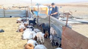 After visiting the A. family’s encampment, whose handicapped daughter we’re trying to help, we drove with her father to see what was happening at Haleth Makhul. The place seems to have become a pilgrimage site. Members of some European organization were also there; they’d come in a jitney and had themselves photographed with one of the locals as a souvenir before leaving. The rubble from the demolition is still visible but it’s been collected into piles; small and large structures are scattered among it, some covered with good quality plastic sheeting. The local resident again recounted the destruction caused by the army’s bulldozers and hoped that Jibran, the attorney from Umm el-Fahm, will be able to deal with the Israeli court system’s red tape and regain the residents’ right to live there. Meanwhile Neta discovered a bustling, bleating kindergarten – a pen of cute baby goats, white, brown, black, spotted – an optimistic sight in this mild, sunny midday weather.