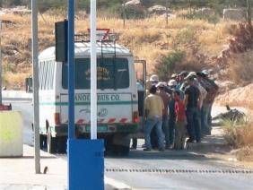The midibus that went north from the Hamra junction arrives at this CP. They give him a sign to approach; stop, and then all the passengers get out. We were happy to see that they were not lined up, but were let go immediately. The soldier in the post on the road thrusts a bottle of water tthrough the front window of the minibus and receives it from the tail end. This happened twice and then the bottle was apparently empty. We went up to the upper post and were not rebuked. Traffic is thin ( it seems that we spent the rush hour at the Hamra CP).