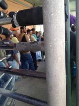 זו שעה שכבר זורמים אל הטרמינל הרבה פועלים שחוזרים לביתם בגדה לאחר העבודה. ירדנו איתם בשרוול ומרחוק כבר ראינו שמאחורי הקרוסלות יש עומס גדול, תורים משתרכים ליד המחשבים המושבתים. בכל זאת, הקרוסלות נפתחות לקליטת פועלים נוספים. בין שני התורים של שני המחשבים יש שביל פנוי, שבו עוברים בשטף הצעירים שעובדים בישראל (לא דוברים עברית) ובונים לנו את חריש. ניסינו לשאול שני עובדי מעבר שנראו מתוך הטרמינל אם ידוע להם שהמחשבים אינם פועלים. לא שמעו ולא ענו, ונעלמו בפנים.