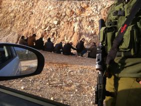 . ישבו להם שם המסכנים , גבם לדרך העפר ופניהם להר וידיהם פשוטות לצדדים. מתברר שהם אזוקים אחד לשני – שלא יברחו – עד שיגיע ה"שב"כ" לקחת אותם.
