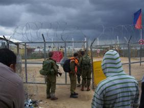 13:10 רכב צבאי מגיע עם חייל ועם מפתח, ושני השערים האפורים נפתחים. תוך 5 דקות חמישייה ראשונה עוברת לעמדת הבידוק. כשהם מסיימים מתאפשר מעבר רגלי גם מכיוון הכפר. אולם השער המרכזי-הצהוב עדין נעול וכלי רכב מעוכבים.