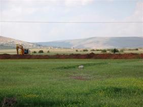 13:50 בין ההתנחלויות רועי ובקעות מגביהים עוד ועוד את סוללות העפר. ממזרח עובד שופל + חייל שומר(?), ממערב עובד מחפרון +