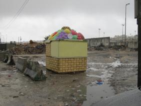 בגלל הגשם נסגר דוכן הקפה הצופה אל מחסום הרכבים.