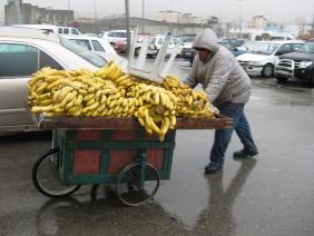 אבל את פאדי לא החג של הנוצרים, לא הגשם וגם לא מיעוט לקוחות הרתיעו. הוא כינס את ראשו בחביון המעיל ודחף עגלה עמוסת אשכולות בננות אל מבוא המחסום. אולי שם ימצאו לקוחות, אולי יצליח להרוויח שקלים אחדים עבור משפחתו שבג'נין. hום חופש או בטלה אינם אופציה למי שצריך לפרנס אישה וילדים.