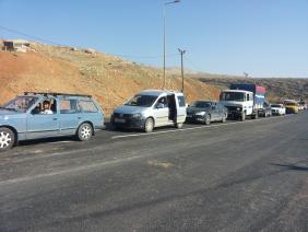 בשעה זה נשרך תור של מעל 20 מכוניות ממזרח, וזו עדיין לא שעת עומס. קראנו בדוח של רחלה חיות ורויטל סלע, שהגיעו למחסום באותו יום אך מאוחר יותר, בשעה 14.1, שניתקלו בתור ארוך מאוד.