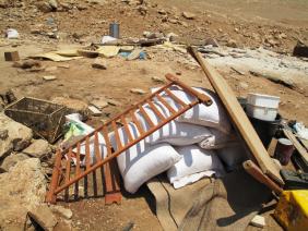 רואות את צינורות הברזל על האדמה ואת מה שנשאר מיריעת הבד. בין ההריסות ראינו גם שרידים של מיטת תינוק (במאהל חיים תינוק ותינוקת), חלקי פח ששימשו כדי לגדר מתחם עבור הצאן ועוקב מים. מה שניצל נאסף תחת העץ במאהל מאולתר. (לפי דו"ח OCHA מ 12.7 הרס צה"ל 32 מבנים באל חדידיה ובראס אל אחמר והותיר 48 איש ללא קורת גג, כולל 13 ילדים).