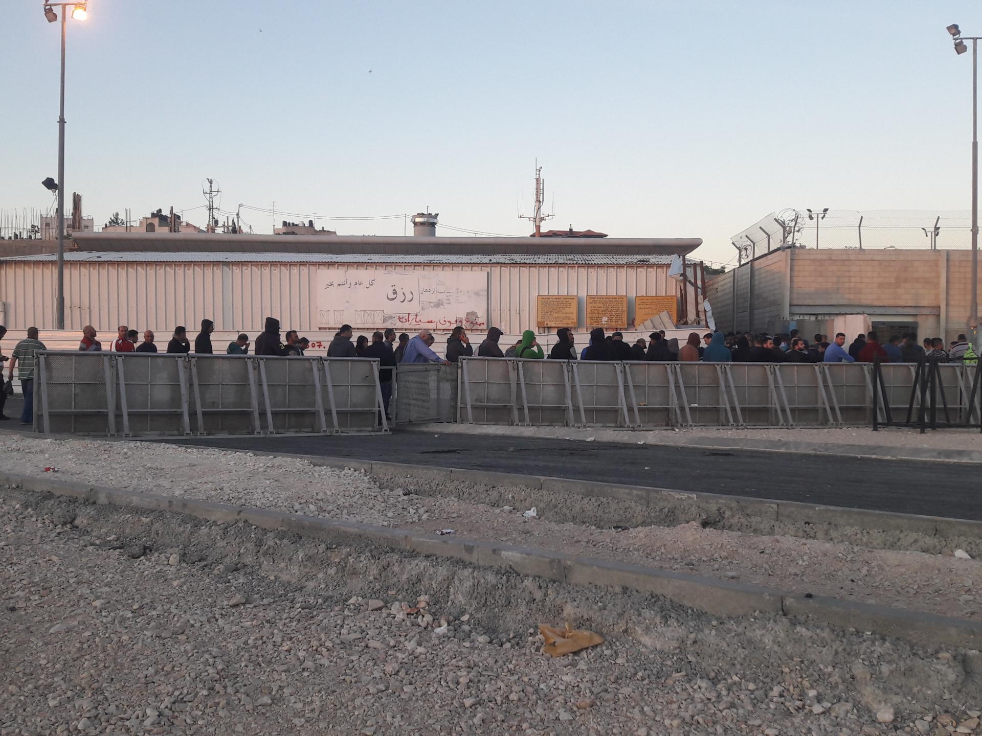 לקראת 6 המתינו אנשים ליד שער ההומניטרי האמור להיפתח. הנשים ברובן הלכו להשתלב בכניסה למכלאות בתורים הרגילים, כשראו שהשער לא נפתח. בסופו של דבר נפתח השער בסביבות 6:15. היו היום הרבה ילדים – תלמידים וילדים שבאים עם הוריהם. המאבטחים הסבירו שבגלל ההכנות לרמדאן סגרו את נתיב התחבורה הציבורית במחסום כלי הרכב, דרכו הם עוברים בד”כ ולכן הם עוברים היום מכאן.