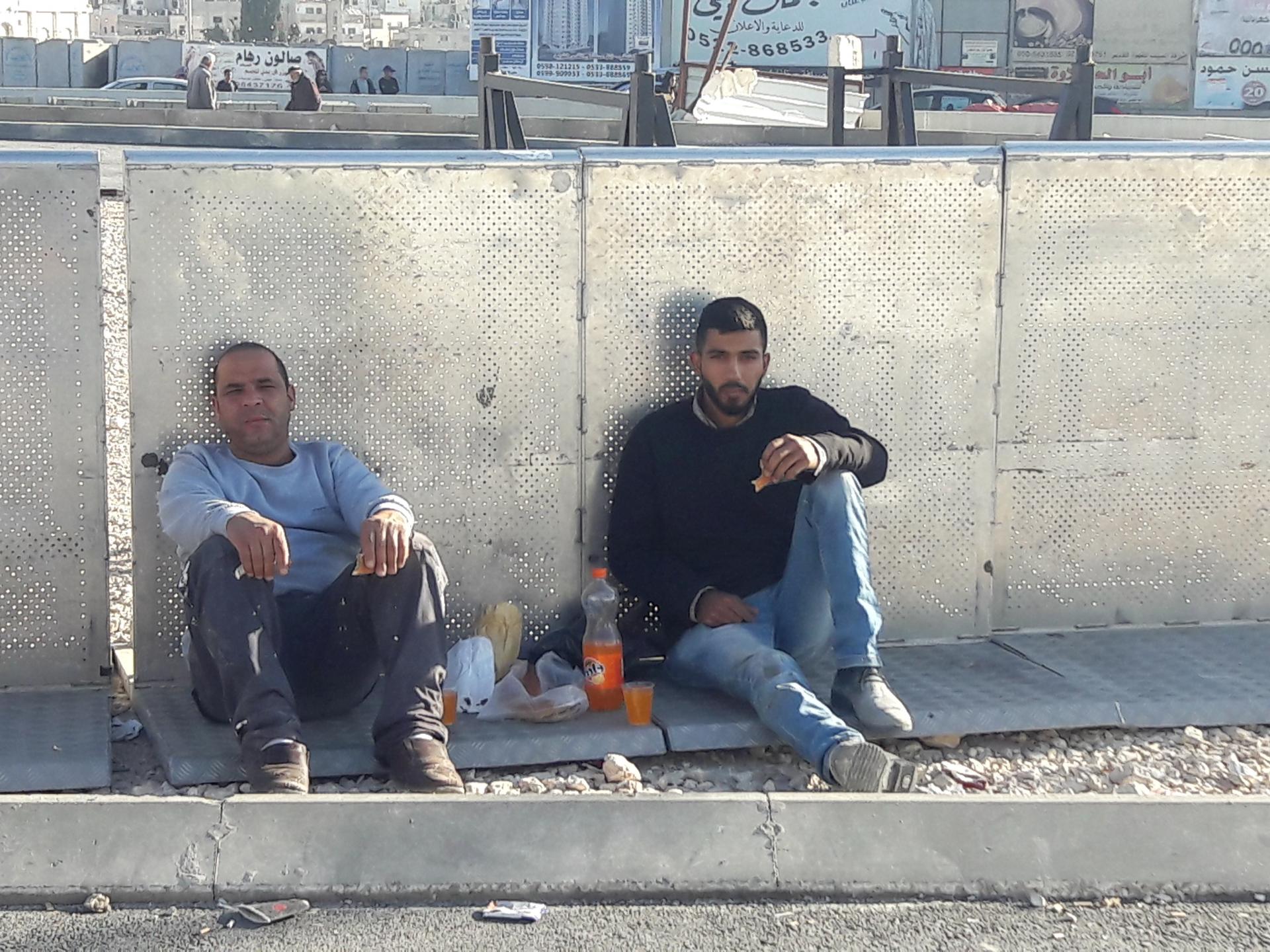 פגשנו את מכרנו ח’ העובד במאפייה במחנה יהודה. הוא אומר שהתור משתרך בחוץ וכנראה מוכר הבייגלה אינו יכול לעבור עם העגלה בגלל שבחוץ יש חצץ. מאוחר יותר כשהאיר השחר יצאנו וראינו שתחמו במחיצות ברזל את הכניסה, כך שהתור יפנה הצידה ולא ישתרך ישירות לכיוון הכביש. כתוצאה מכך לא ניתן לעבור דרך שטח סלול בלבד, אלא יש לעבור דרך השטח המכוסה חצץ, כפי שרואים בתמונה.