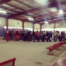 קצת אחרי שש נוצרו מדי פעם תורים, אך לא גלשו הרבה מעבר למכלאות, ולא יצאו מן הסככה אל החניה. רוב הממתינים בד"כ במעבר ההומניטרי הלכו לתור הרגיל. כשהגיע הנגד מהמת"ק, הוא והשוטר העבירו מדי פעם גם בשער ההומניטרי, אך לא היה לחץ על השער בשום שלב.