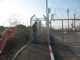07:08 הם מגיעים אל המחסום. שער הכביש פתוח. שער השרוול של הולכי הרגל נעול. מישהו עומד לידו. מחכה. אחת המ"צ מברכת אותו בתנועת יד לשלום. האיש נכנס. העדר עובר.
