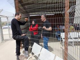 באסם תמימי, תמונה עליונה, הגיע עם אשתו (הוא שוחרר לפני כחודש בתנאים מאוד מגבילים בשל מצב בריאותה הקשה של אמו הישישה) והמתין כשעתיים להיכנס לאולם ביהמ"ש. יחד אתו המתינו (מעבר לגדר שמפרידה בין פלסטינים הבאים מהשטחים הכבושים לבין מבקרים